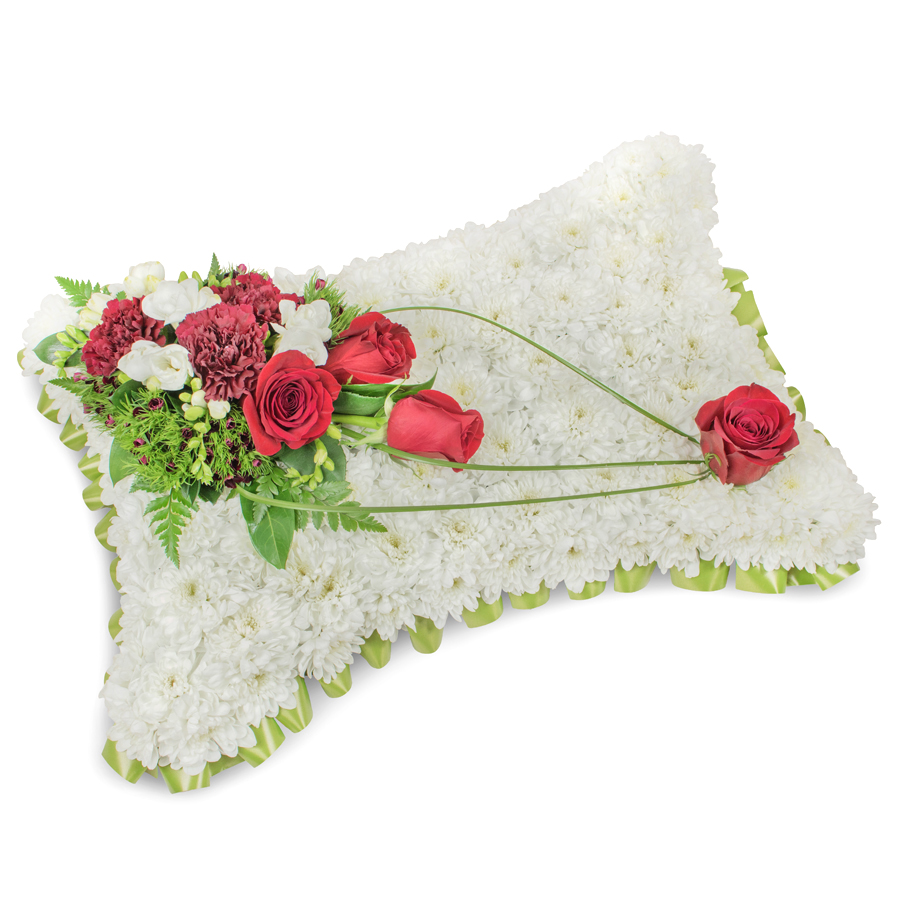 Convey your deepest sympathies with our beautiful condolence arrangement. This exquisite bouquet showcases a unique combination of white chrysanthemums, red roses, white freesias, dark red carnations, dianthus, and bear grass, carefully selected to symbolize love and remembrance.