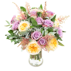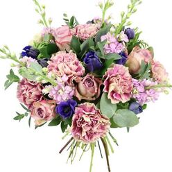 Immerse yourself in the radiant harmony of our stunning bouquet, adorned with blue hydrangeas, light purple roses, green lisianthus, white spray roses, Ammi visnaga, pink bouvardia, and pink astilbe.